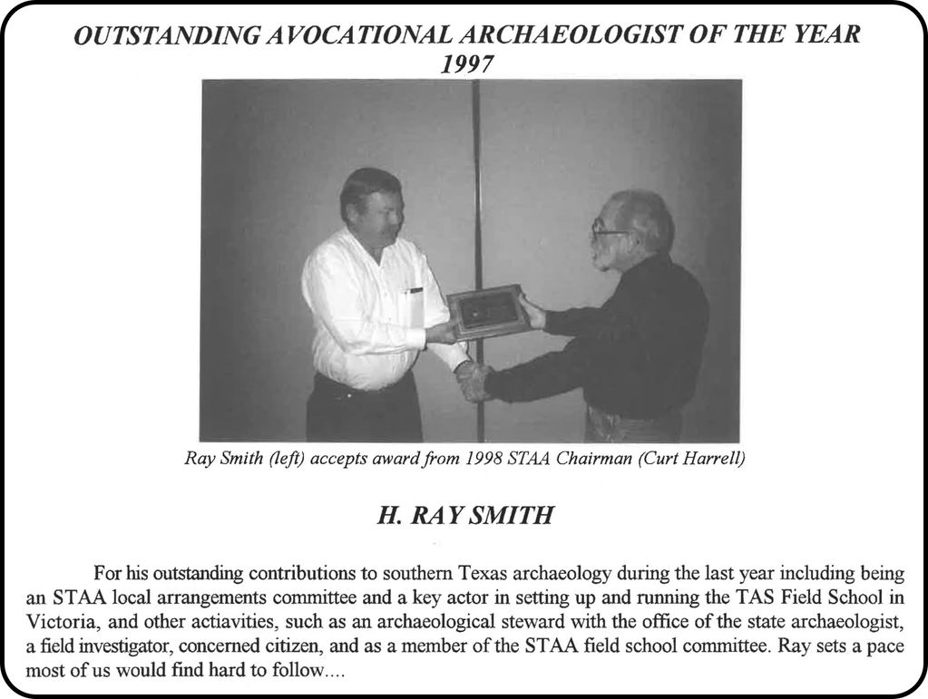 "For his [H. Ray Smith] outstanding contributions to southern Texas archaeology during the last year including being an STAA local arrangements committee and a key actor in setting up and running the TAS Field School in Victoria...." La Tierra 1998, Vol 25-1