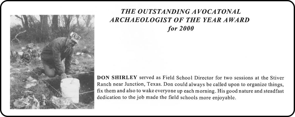 "Don Shirley served as Field School Director for two sessions at the Stiver Ranch near Junction, Texas. Don could always be called upon to organize things, fix them and also to wake everyone up each morning..." La Tierra 2002, Vol. 29-4