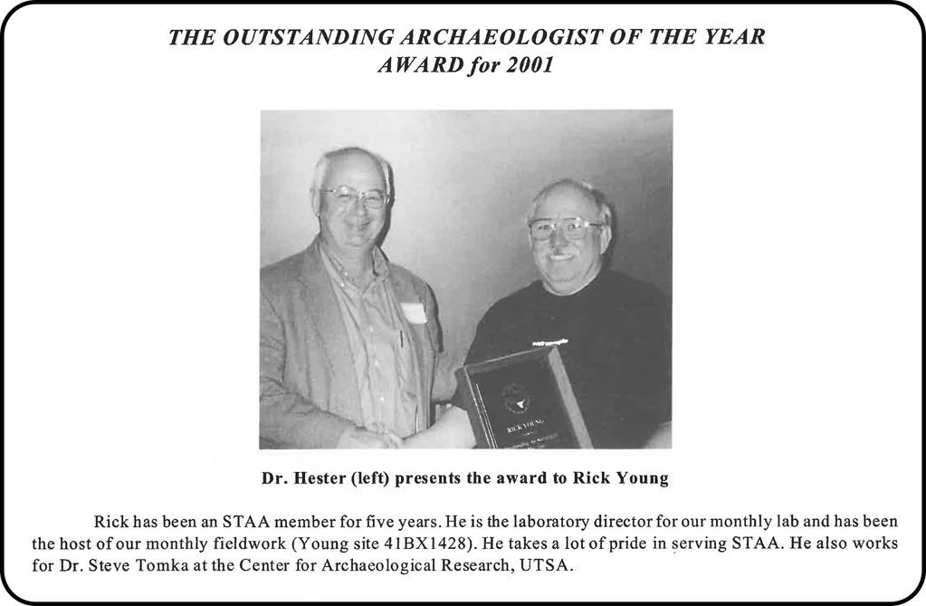 "Rick [Young] has been an STAA member for five years. He is the laboratory director for our monthly lab and has been the host of our monthly fieldwork (Young site 41BX1428). He takes a lot of pride in serving STAA..." La Tierra 2002, Vol. 29-4