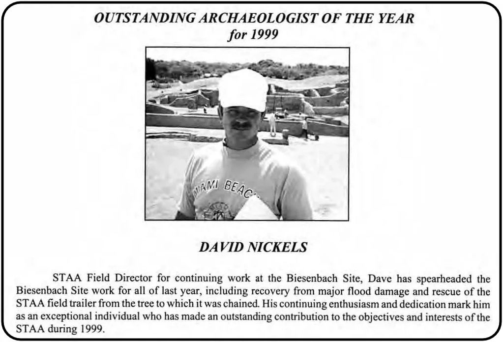 "STAA Field Director for continuing work at the Biesenbach Site, Dave [David Nickels] has spearheaded the Biesenbach Site work for all of last year...His continuing enthusiasm and dedication mark him as an exceptional individual who has made an outstanding contribution to the objectives and interests of the STAA during 1999." La Tierra 2000, Vol. 27-1
