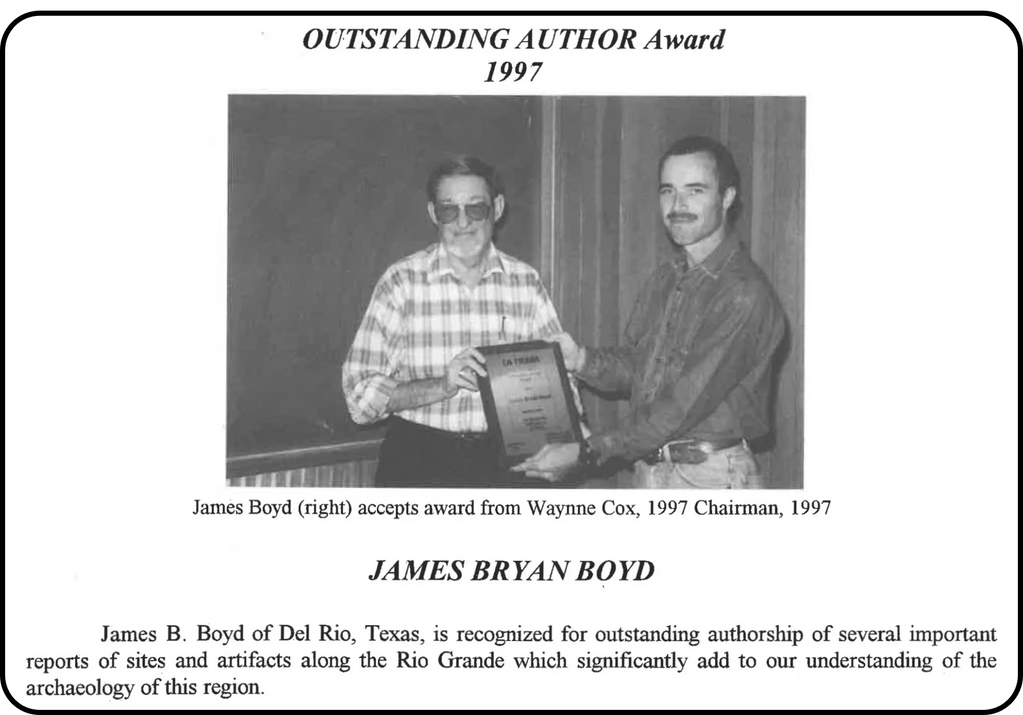 "James B. Boyd of Del Rio, Texas, is recognized for outstanding authorship of several important reports of sites and artifacts along the Rio Grande which significantly add to our understanding of the archaeology of this region." La Tierra 1998, Vol. 25-1