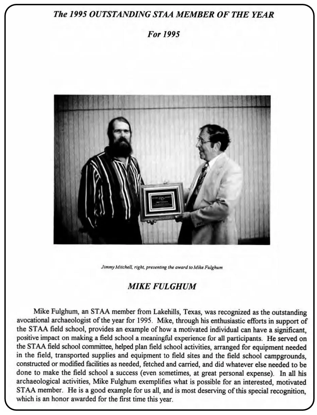 "Mike Fulghum, an STAA member from Lakehills, Texas...In all his archaeological activities, Mike Fulghum exemplifies what is possible for an interested, motivated STAA member." La Tierra 1996, Vol. 23-1