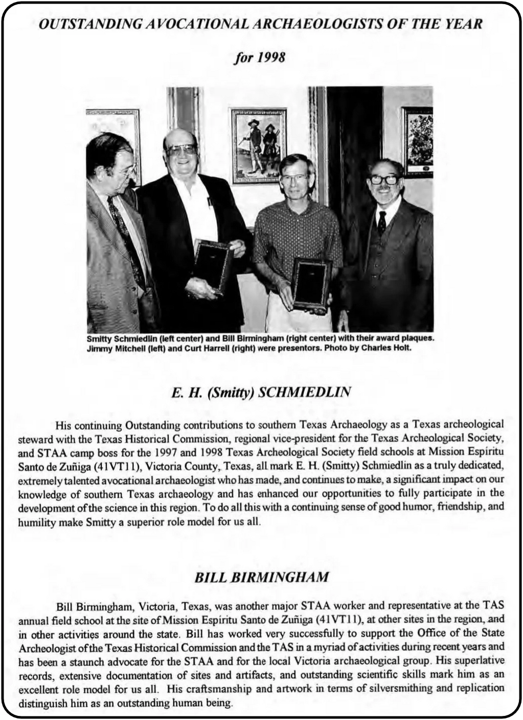 "His continuing Outstanding contributions to southern Texas Archaeology....all mark E. H. (Smitty) Schmiedlin as a truly dedicated, extremely talented avocational archaeologist...Bill Birmingham....was another major STAA worker and representative at the TAS annual field school..." La Tierra 1999, Vol. 26-1