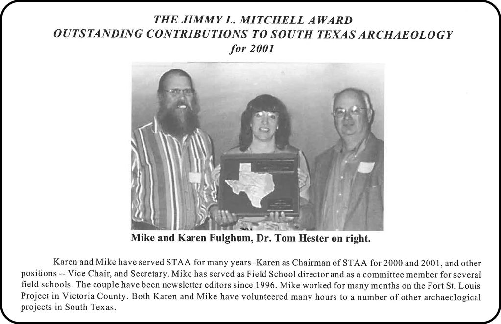 "Kevin and Mike [Fulghum] have served STAA for many years--Karen as Chairman of STAA for 2000 and 2001...Mike has served as Field School director and as a committee member for several field schools....both Karen and Mike have volunteered many hours to a number of other archaeological projects in South Texas." La Tierra 2002, Vol. 29-4